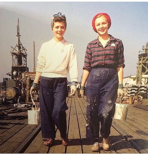 Anii 40 le obligă pe femei să poarte pantaloni zilnic, dar mai degrabă ca uniformă de lucru, din rațiuni practice. În timpul celui de-al doilea război mondial, ele au preluat o mare parte din activitățile bărbaților plecați la arme, motiv pentru care s-au echipat comod, și-au suflecat mânecile, au intrat în fabrici și uzine si au spus "We can do it". Rosie the Riveter este imaginea colectivă a doamnelor din anii 40. Pantalonii erau în continuare largi, dar puțin mai strâmți spre gleznă, se închideau în lateral, șlițul cu fermoar în față fiind în continuare considerat prea masculin. Sunt din materiale mai groase, din denim și de multe ori sub forma de salopetă.