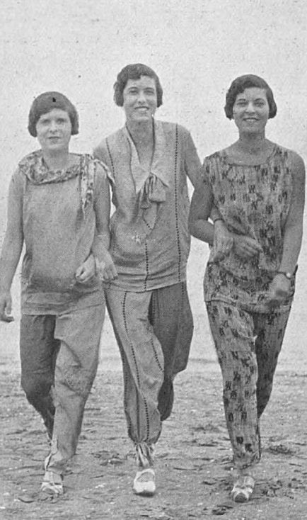 Au urmat anii 20 și moda flapper, când atitudinea femeilor occidentale era deja ostentativă față de ceea ce era considerat până atunci un comportament rezonabil pentru o femeie. Pantalonii se poartă tot mai des, mai ales pentru activități sportive, pentru șofat, călărit și de către prima femeie pilot care a traversat Atlanticul, doamna Amelia Earhart. Sunt fie largi în zona șoldului și se încheie cu o betelie strâmtă, sub genunchi, fie fac parte din costumul de plajă tip pijama. Nu te așteptai ca seturile model pijama foarte populare și în ziua de astăzi, să se fi purtat în public atât de devreme în istorie, nu?